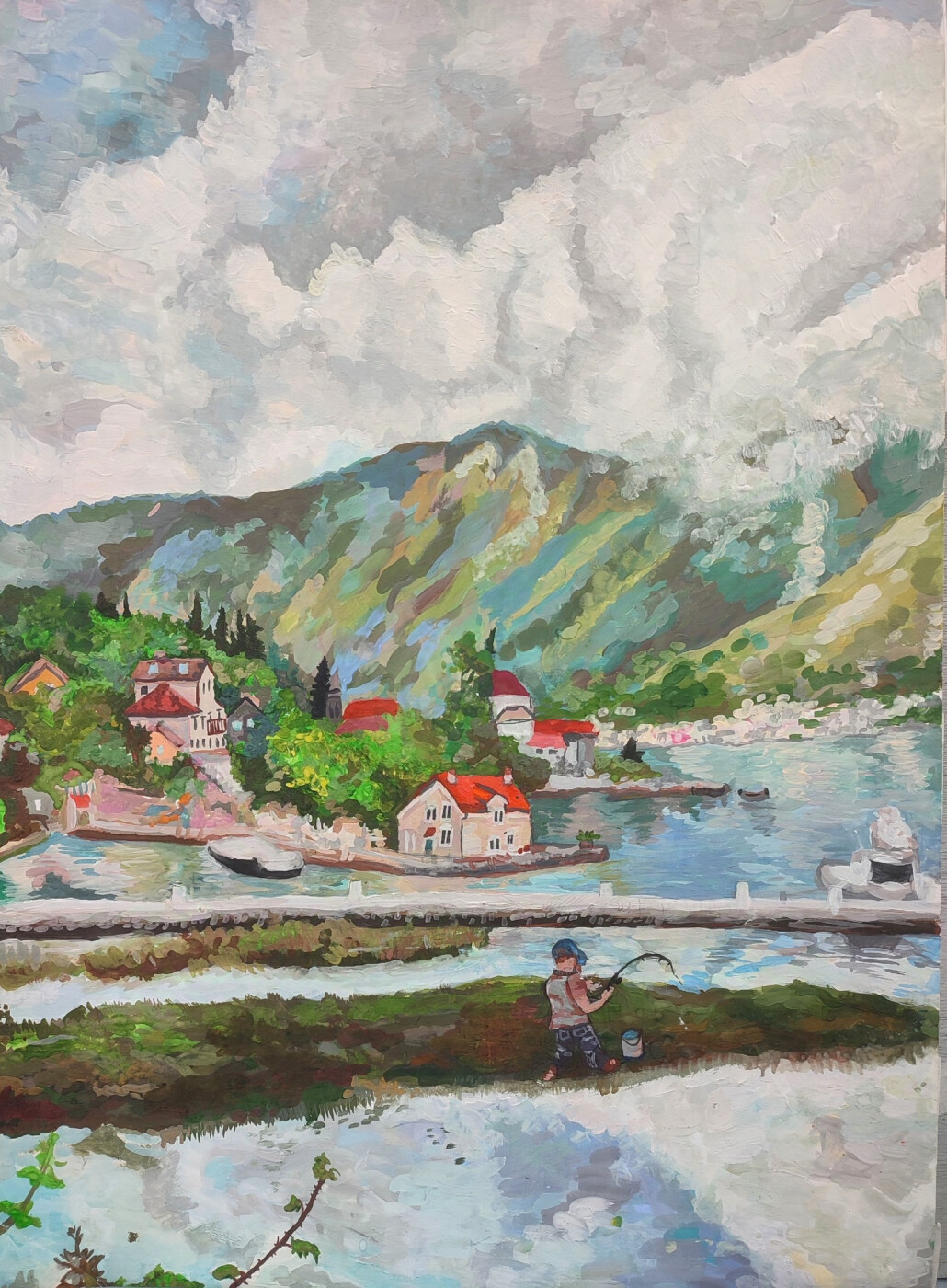 Одним летним утром, я решила встретить рассвет. Встав пораньше я отправилась в путь, но на улице была пасмурная погода без лучей солнца. Я отчаялась и пошла домой. По пути домой, я увидела рыбака ловящего рыбу. Ему на крючок попалась огромна рыба и он с азартом пытался вытащить ее. Также меня вдохновил вид, который был за рыбаком. Я расстроилась, что не смогла увидеть утренний рассвет и решила запечатлеть не менее интересный сюжет.