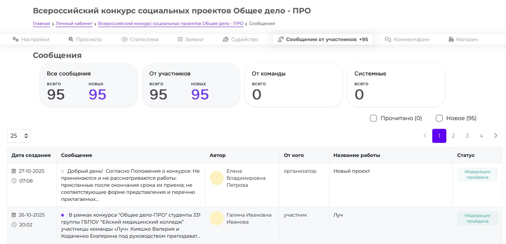 Раздел «Сообщения» подключается в качестве дополнительной опции и агрегирует все сообщения участников конкурса.