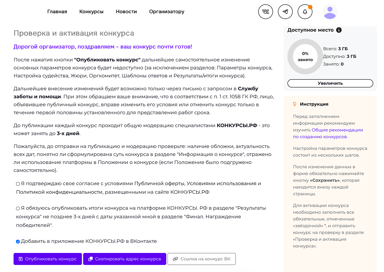 После заполнения информации о конкурсе и настройки его параметров необходимо активировать конкурс - сделать это можно в разделе Проверка и активация конкурса.