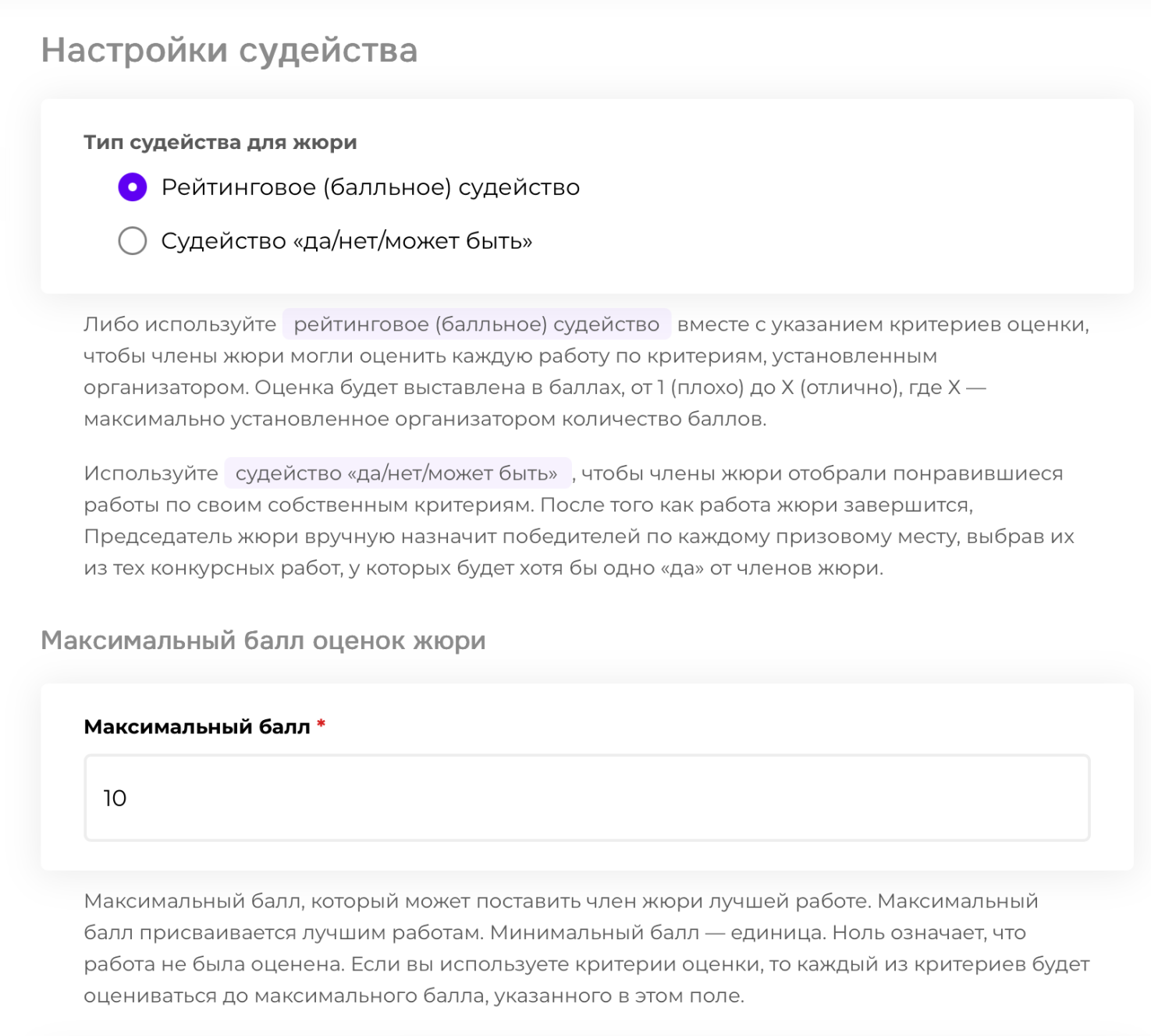 Также вы можете назначить Максимальный балл оценок жюри - это значение будет максимальным баллом, который может поставить член жюри лучшей работе. Минимальный балл — единица. Ноль означает, что работа не была оценена.