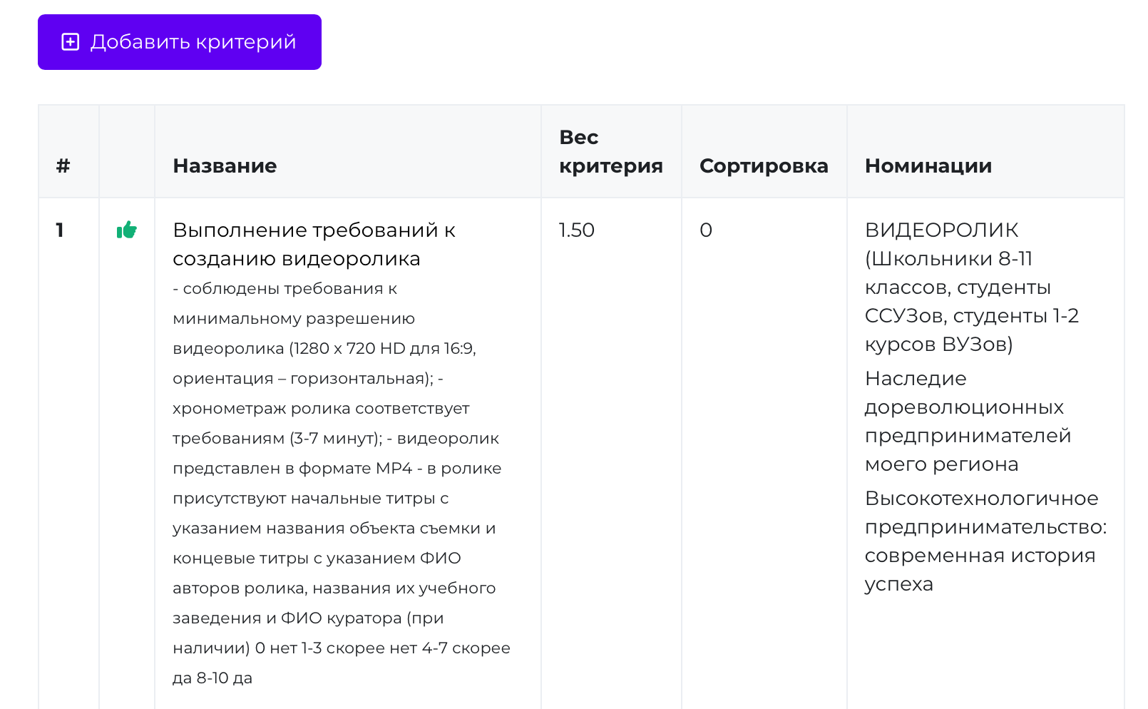 Ниже вы найдете таблицу со списком всех добавленных критериев оценки работ конкурса с указанием их наименования, сортировки и отнесения к номинациям.