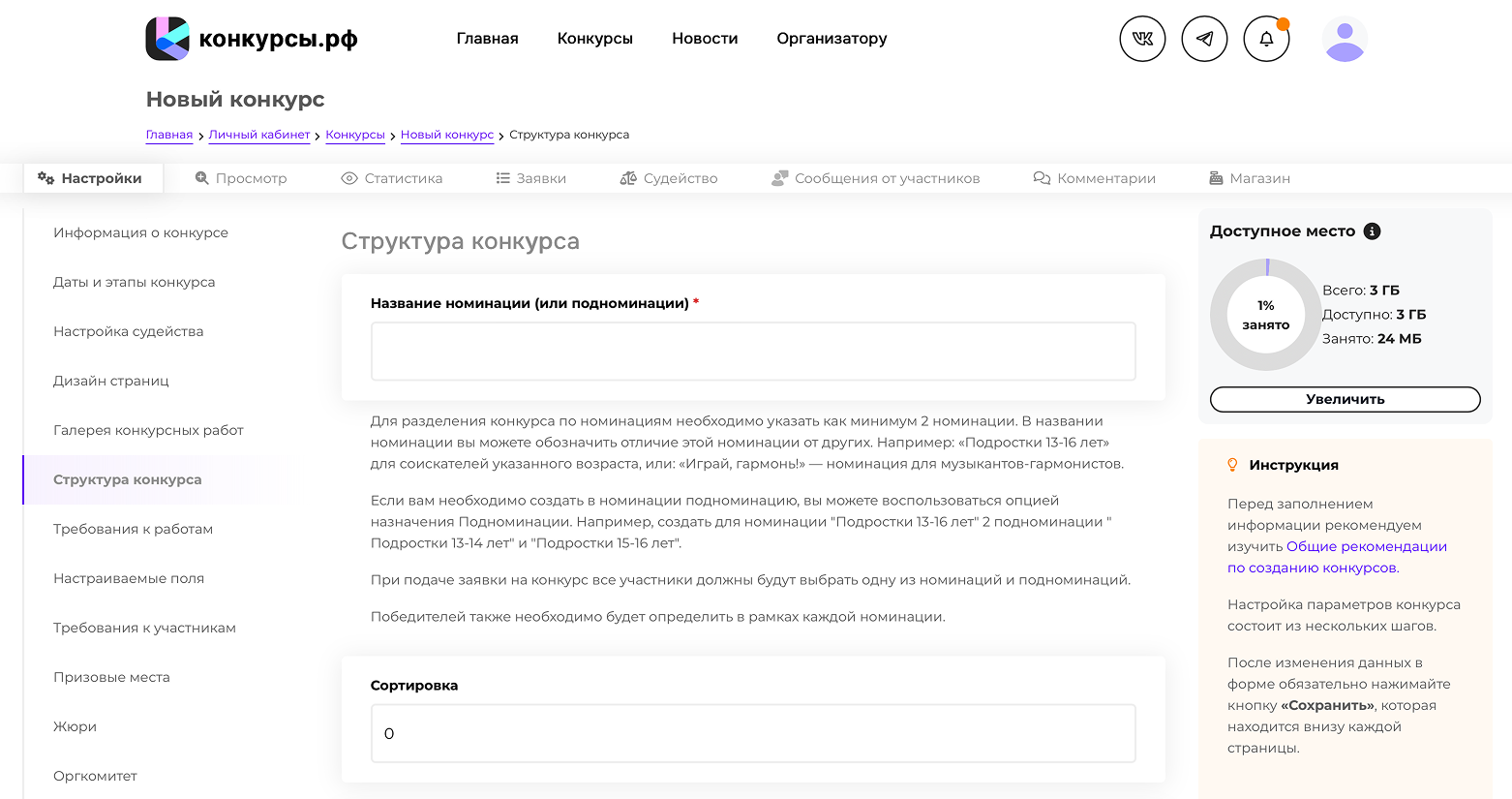 Раздел Структура конкурса позволяет добавить номинации и подноминации конкурса.
