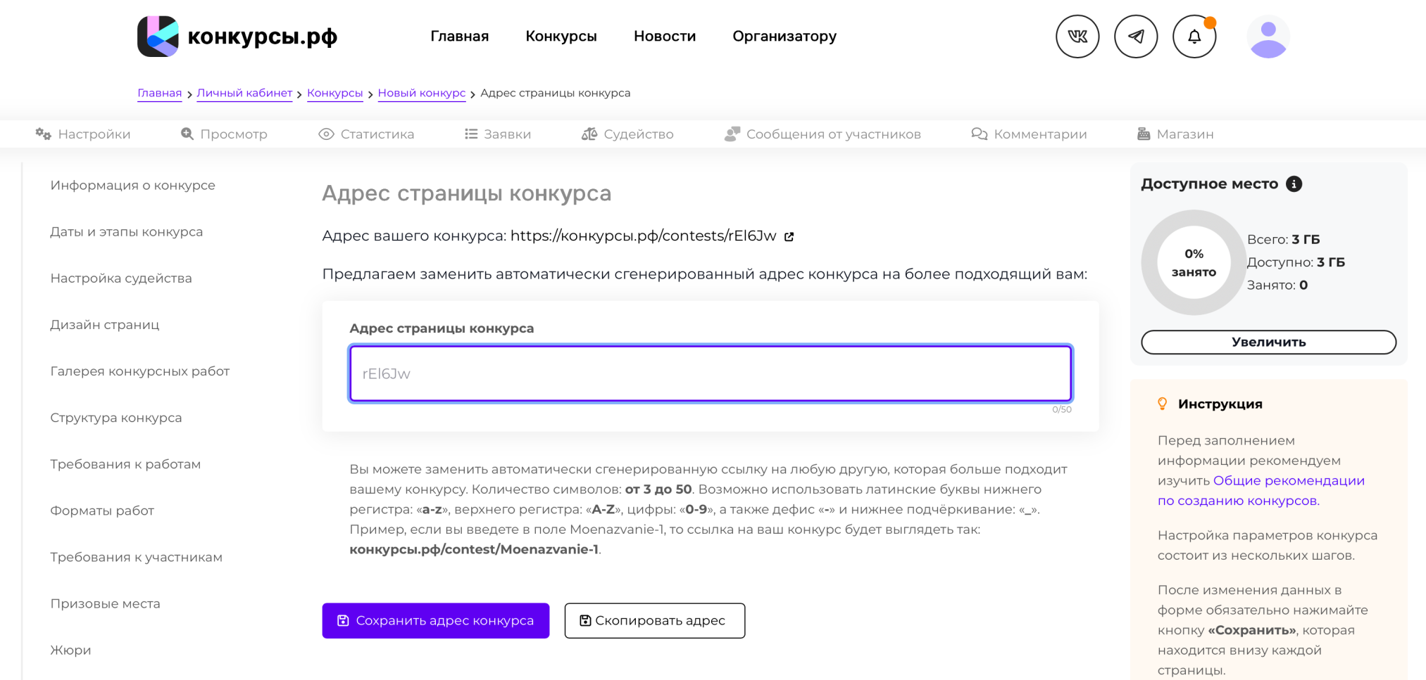 Раздел «Адрес страницы конкурса» позволяет изменить автоматически сгенерированный адрес страницы вашего конкурса на требуемый вам.