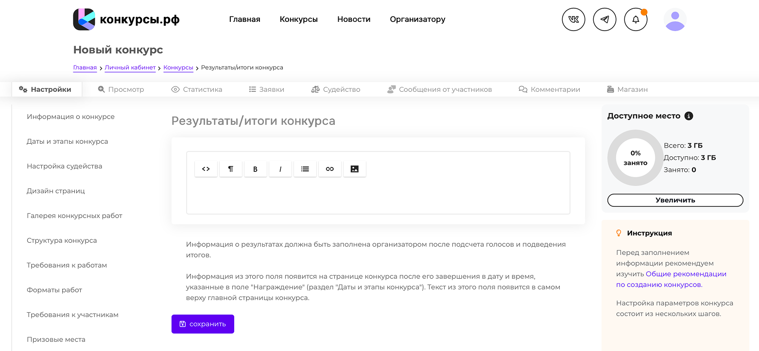 Раздел «Результаты / Итоги конкурса» заполняется организатором после подсчета голосов и подведения итогов.