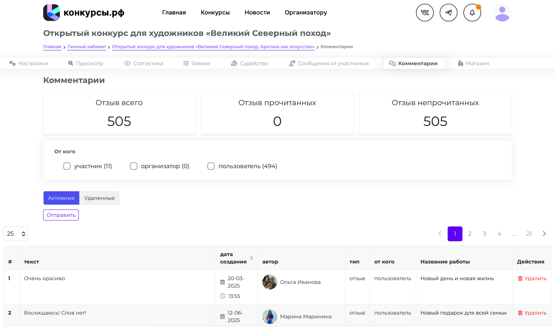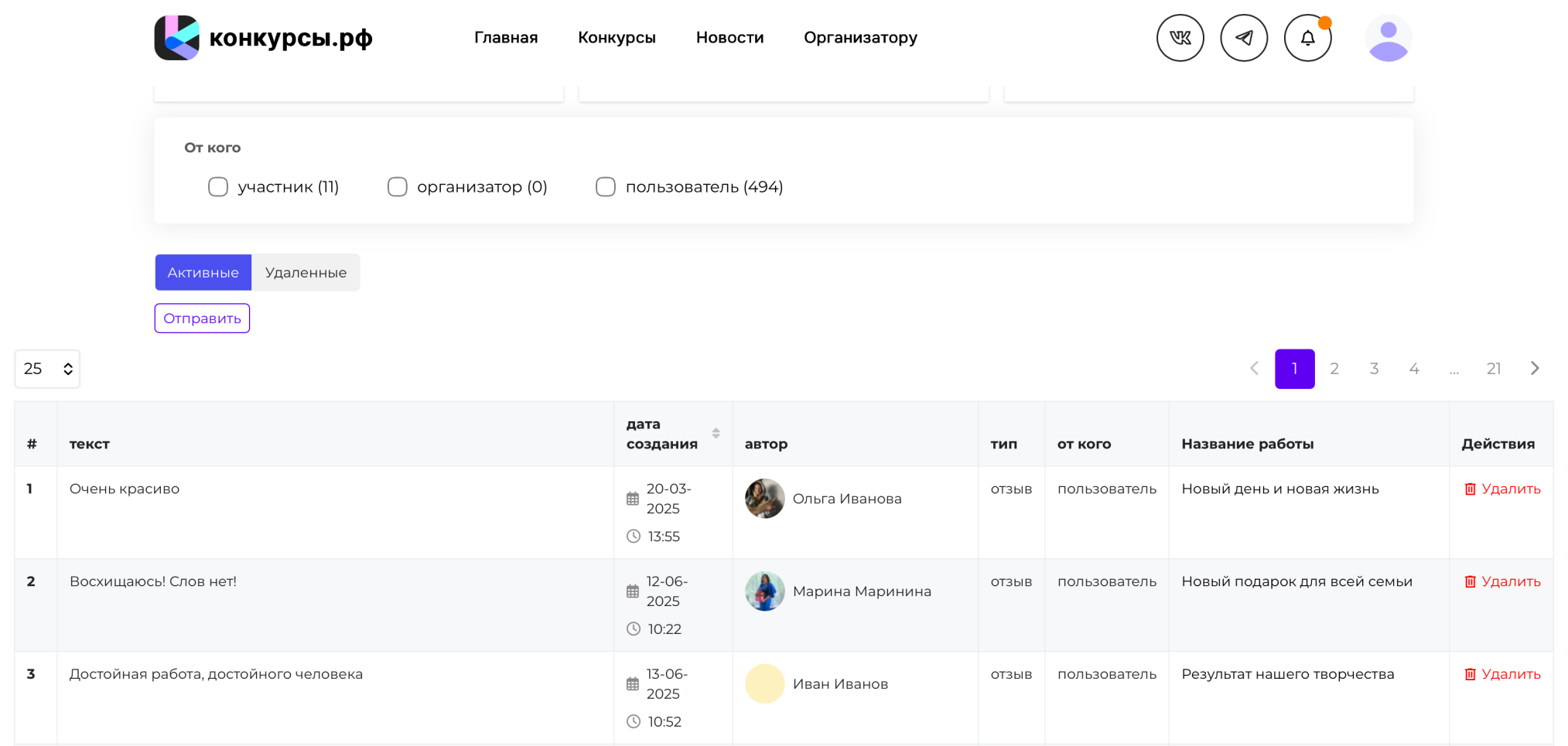 Пользователь - комментарии и отзывы, которые были оставлены пользователям платформы, не являющимися участниками конкурса или членами оргкомитета.